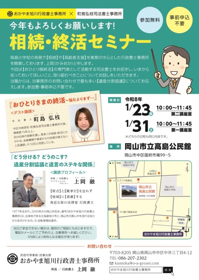 1月23日(金)と1月31日(土)の2回やります。今回は、司法書士・町島弘枝先生をお招きして『おひとりさまの終活』をテーマにお話しいただくことにしました。当職からは、当事務所のご相談で一番多い『遺産分割協議』をテーマにお伝えします。参加無料、事前申込も不要です。